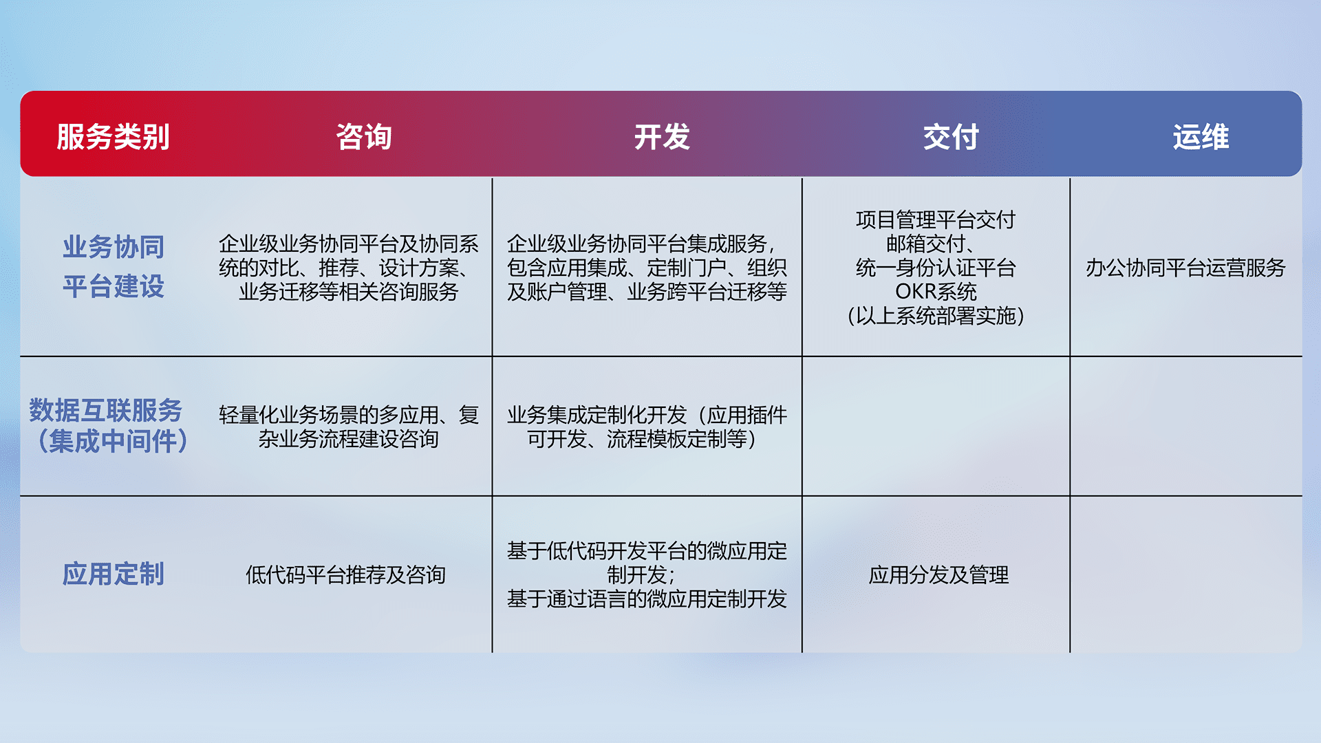 针对钉钉、、、、企微、、、IDaas等平台级产品提供产品的规划、、、方案、、、交付、、、、定制化开发等服务,,实现如统一协同办公、、、、智能客户服务、、、、混合会议管理、、、、智能数据查询、、、等业务场景,,实现数字化转型。。。
